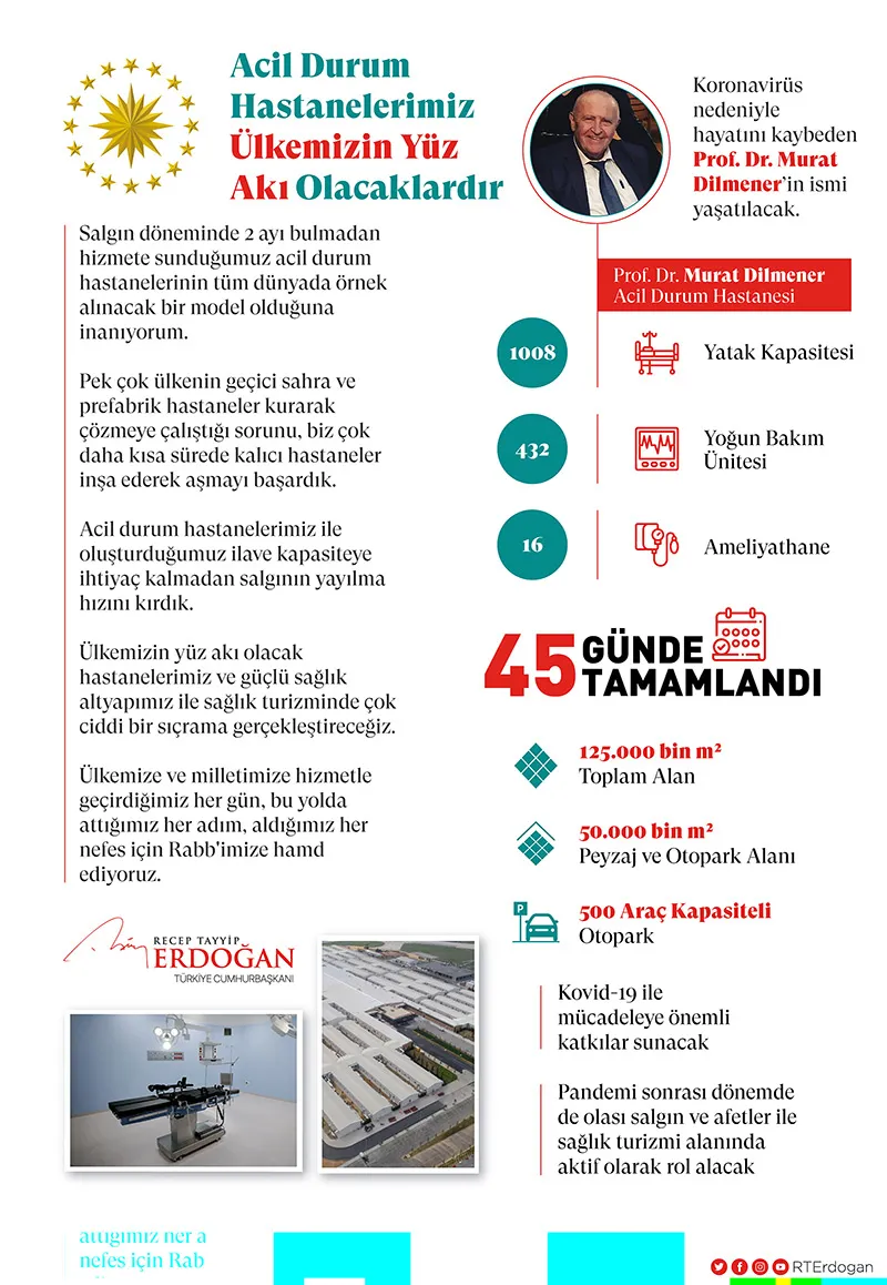 Erdoğan'ın bugün yapılan açılışta yaptığı konuşmanın satır başlarının yer aldığı grafikte merhum Prof. Dr. Murat Dilmener'in fotoğrafı ve hastane görselleri de yer aldı.