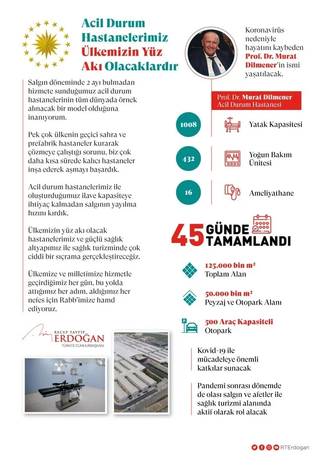 Erdoğan'ın bugün yapılan açılışta yaptığı konuşmanın satır başlarının yer aldığı grafikte merhum Prof. Dr. Murat Dilmener'in fotoğrafı ve hastane görselleri de yer aldı.