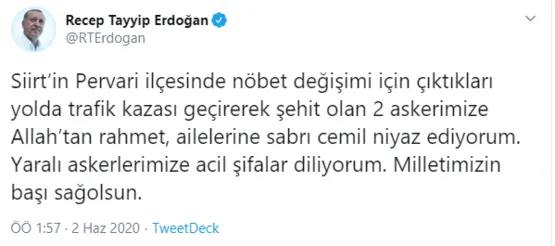 Erdoğan paylaşımında: "Siirt'in Pervari ilçesinde nöbet değişimi için çıktıkları yolda trafik kazası geçirerek şehit olan 2 askerimize Allah'tan rahmet, ailelerine sabrı cemil niyaz ediyorum. Yaralı askerlerimize acil şifalar diliyorum. Milletimizin başı sağolsun." ifadelerini kullandı.