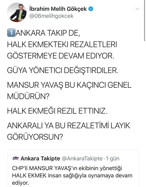 Gökçek, Ankara Takipte hesabının paylaştığı, kirli börek ve baklava tepsilerinin temizlendiği belirtilen yerin fotoğraflarını da paylaşarak, "Ankara takip de, halk ekmekteki rezaletleri göstermeye devam ediyor. Güya yönetici değiştirdiler. Mansur Yavaş bu kaçıncı genel müdürün? Halk Ekmeği rezil ettiniz. Ankaralı ya bu rezaletimi layık görüyorsun?" dedi.