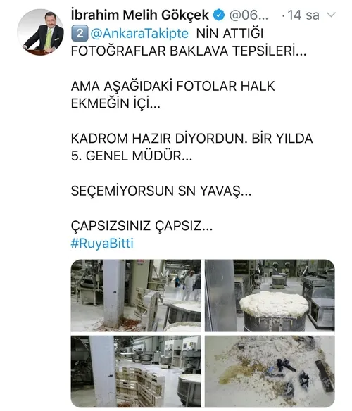 Halk Ekmek Fabrikası'nın ve kazanların hijyenden uzak fotoğraflarını paylaşan Gökçe,: "Aşağıdaki fotolar halk ekmeğin içi... Kadrom hazır diyordun. Bir yılda 5. genel müdür... Seçemiyorsun Sn Yavaş... Çapsızsınız çapsız... #ruyabitti" paylaşımında bulundu.
