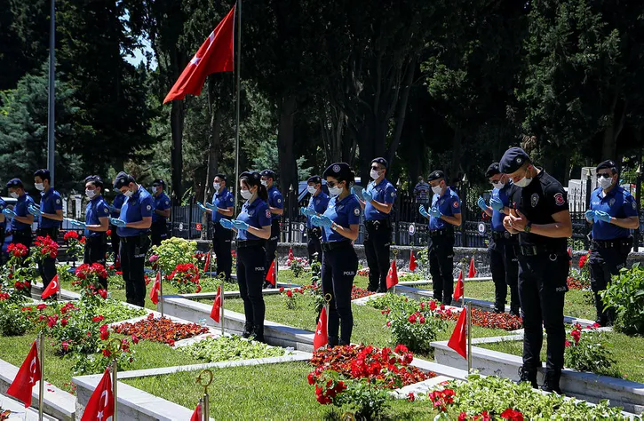 ŞEHİTLİKTEKİ POLİSLERİN KABİRLERİNE KARANFİL BIRAKILDI.