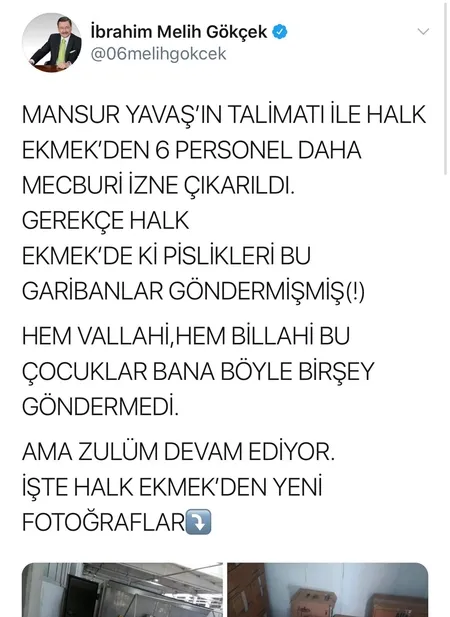 AK Parti Ankara Büyükşehir Belediyesi eski Başkanı İbrahim Melih Gökçek, sosyal medya hesabından CHP'li Mansur Yavaş'ın talimatıyla Halk Ekmek'ten altı personelin daha mecburi izne çıkarıldığını duyurdu. Gökçek, "Mansur Yavaş'ın talimatı ile Halk Ekmek'ten 6 personel daha mecburi izne çıkarıldı. Gerekçe Halk Ekmek'teki pislikleri bu garibanlar göndermişmiş (!) hem vallahi, hem billahi bu çocuklar bana böyle bir şey göndermedi. Ama zulüm devam ediyor. İşte Halk Ekmek'ten yeni fotoğraflar" diyerek görüntüleri paylaştı.