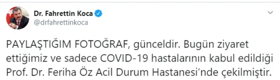 Sosyal medya hesabından sık sık koronavirüsle ilgili maske, mesefa ve temizlik uyarısı yapan Sağlık Bakanı Fahrettin Koca'dan bir uyarı daha geldi. Koca paylaşımında bir acil durum hastasının bugün çekilen fotoğrafını paylaşarak şu ifadeleri kullandı: PAYLAŞTIĞIM FOTOĞRAF, günceldir. Bugün ziyaret ettiğimiz ve sadece COVID-19 hastalarının kabul edildiği Prof. Dr. Feriha Öz Acil Durum Hastanesi'nde çekilmiştir. İşte Bakan Koca'nın o paylaşımı.