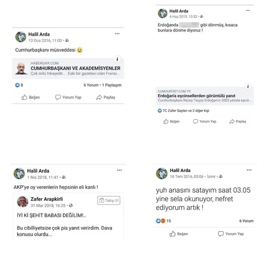 İzmir'deki CHP Gaziemir Belediye Başkanı Halil Arda, "Erdoğan'da eş. gibi dönmüş, kısaca bunlara dön. diyoruz!" diyerek hakaretler etti. Arda, "Yuh a. sat., saat 03.05 yine sela okunuyor, nefret ediyorum artık!" diyerek küfür etti.