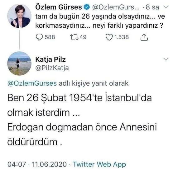 Üç kuşaktır CHP'liyim diyen Katja Pilz, isimli sosyal medya kullanıcısı ise "Ben 26 Şubat 1954'te İstanbul'da olmak isterdim. Erdoğan doğmadan önce annesini öldürürdüm" diyerek nefretini sürdürdü. CHP'li Ekrem İmamoğlu ve Mansur Yavaş hayranı olan Pilz, Canan Kaftancıoğlu'nun ise her daim takipçisi olduğu sosyal medyadan da anlaşıldı.