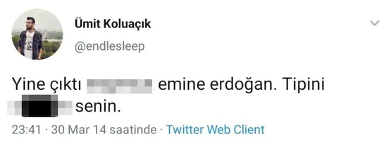 Bir başka sosyal medya kullanıcısı Ümit Koluaçık, "Yine çıktı may. Emine Erdoğan. Tipini s.. senin" diyerek hakaretlerini sürdürdü.