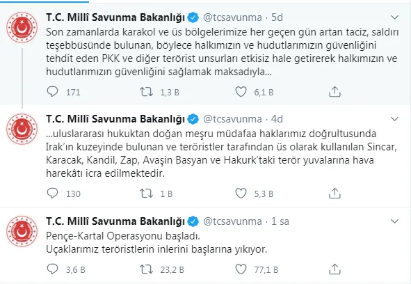 Milli Savunma Bakanlığı'ndan yapılan açıklamada, "Pençe-Kartal Operasyonu başladı. Uçaklarımız teröristlerin inlerini başlarına yıkıyor. Son zamanlarda karakol ve üs bölgelerimize her geçen gün artan taciz, saldırı teşebbüsünde bulunan, böylece halkımızın ve hudutlarımızın güvenliğini tehdit eden PKK ve diğer terörist unsurları etkisiz hale getirerek halkımızın ve hudutlarımızın güvenliğini sağlamak maksadıyla uluslararası hukuktan doğan meşru müdafaa haklarımız doğrultusunda Irak’ın kuzeyinde bulunan ve teröristler tarafından üs olarak kullanılan Sincar, Karacak, Kandil, Zap, Avaşin Basyan ve Hakurk’taki terör yuvalarına hava harekâtı icra edilmektedir" ifadelerine yer verildi