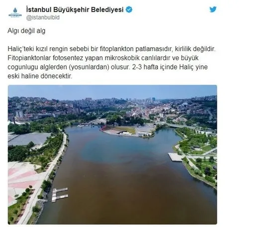İBB'den yapılan açıklamadai "Haliç'teki kızıl rengin sebebi bir fitoplankton patlamasıdır, kirlilik değildir. Fitopianktonlar fotosentez yapan mikroskobik canlılardır ve büyük cogunlugu alglerden (yosunlardan) oluşur. 2-3 hafta içinde Haliç yine eski haline dönecektir" iddiasında bulundu.