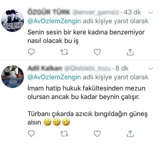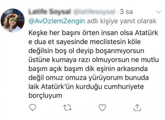 Twitter hesabından ise yaptığı paylaşımda "İster Köyde İster F-35 kokpitinde İster Okulda çarşıda evde İsterse Meclis'te Hilafsız Başörtüsü "Başörtüsüdür". Sadece bir gerçeğin tespiti üzerine yazılanlarsa 'Nefret Suçunun' resmidir. Ve 1000 yıl sürecek iddiasıyla bu suçu işleyen kafa mıh gibi aynı yerindedir" ifadelerini kullandı.