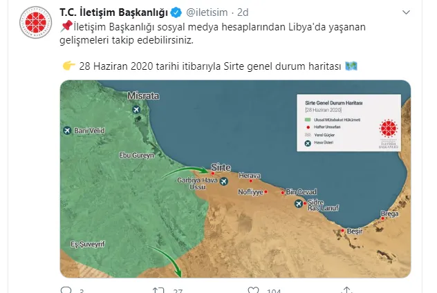 "28 Haziran 2020 tarihi itibarıyla Libya genel durum haritası" ifadeleriyle yapılan paylaşımda Libya'daki güncel gelişmelerin aktarılmaya devam edeceği bilgisine yer verildi. İletişim Başkanlığı Suriye'deki gelişmeleri de sosyal medya hesabından paylaşıyor.