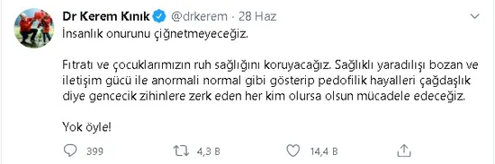 Kızılay Başkanı Kerem Kınık LGBT sapkınlığa sert tepki göstermiş, "İnsanlık onurunu çiğnetmeyeceğiz. Fıtratı ve çocuklarımızın ruh sağlığını koruyacağız. Sağlıklı yaradılışı bozan ve iletişim gücü ile anormali normal gibi gösterip pedofilik hayalleri çağdaşlık diye gencecik zihinlere zerk eden her kim olursa olsun mücadele edeceğiz. Yok öyle!" ifadelerini kullanmıştı. Kınık bu açıklamasının ardından Uluslararası Kızılay ve Kızılhaç Dernekleri Federasyonu (IFRC) tarafından hedef alınmıştı!