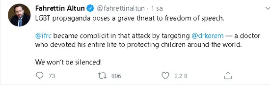 Altun Twitter üzerinden İngilizce olarak yaptığı açıklamada, IFRC'nin LGBT proparagandası yaptığını ve hayatını dünya çocuklarına adamış olan Kerem Kınık'ı hedef aldığını belirtti. Altun "Susturulmayacağız" dedi.