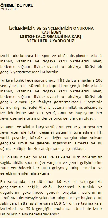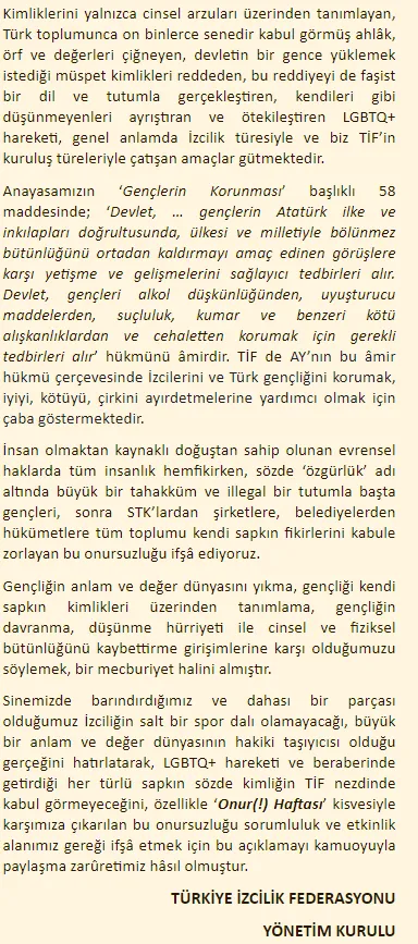 Sinemizde barındırdığımız ve dahası bir parçası olduğumuz İzciliğin salt bir spor dalı olamayacağı, büyük bir anlam ve değer dünyasının hakiki taşıyıcısı olduğu gerçeğini hatırlatarak, LGBTQ+ hareketi ve beraberinde getirdiği her türlü sapkın sözde kimliğin TİF nezdinde kabul görmeyeceğini, özellikle 'Onur(!) Haftası' kisvesiyle karşımıza çıkarılan bu onursuzluğu sorumluluk ve etkinlik alanımız gereği ifşâ etmek için bu açıklamayı kamuoyuyla paylaşma zarûretimiz hâsıl olmuştur.