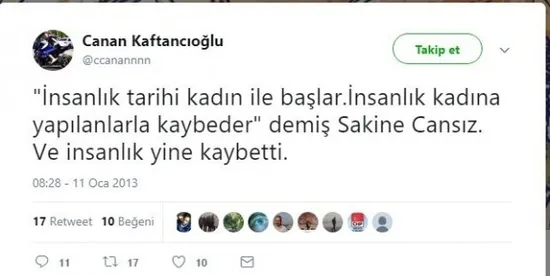Canan Kaftancıoğlu, PKK terörist Sakine Cansız ile ilgili attığı bir tweetinde "İnsanlık tarihi kadın ile başlar. İnsanlık kadına yapılanlarla kaybeder' demiş Sakine Cansız. Ve insanlık yine kaybetti" sözlerini kullanmış, örgüt mensubuna bu şekilde destek vermişti. Daha sonra da bu tweetini silmişti.