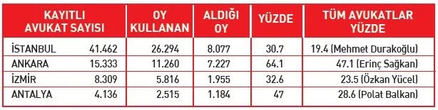 AK Parti Grup Başkanvekili Cahit Özkan'ın basın toplantısında rakamlarla anlattığı barolardaki temsil adaletsizliği dikkat çekici. Mehmet Durakoğlu, oyların yüzde 30.7'sini alarak İstanbul Barosu Başkanı seçildi. İstanbul Barosu'nda avukatların yüzde 69.3'ü temsil edilmiyor. Özkan Yücel ise oyların yüzde 32.6'sını alarak İzmir Baro Başkanı oldu. İzmir Barosu'nda ise avukatların yüzde 67.4'ü temsil edilmiyor. Benzer bir tablo Ankara ve Antalya'da da var.