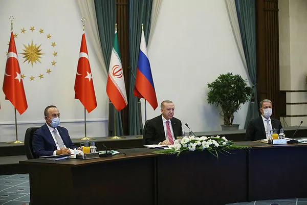 Cumhurbaşkanı Erdoğan, Rusya Devlet Başkanı Vladimir Putin ve İran Cumhurbaşkanı Hasan Ruhani'nin videokonferans yöntemiyle katıldığı Astana Formatında Türkiye-Rusya Federasyonu-İran Üçlü Zirvesi başladı.