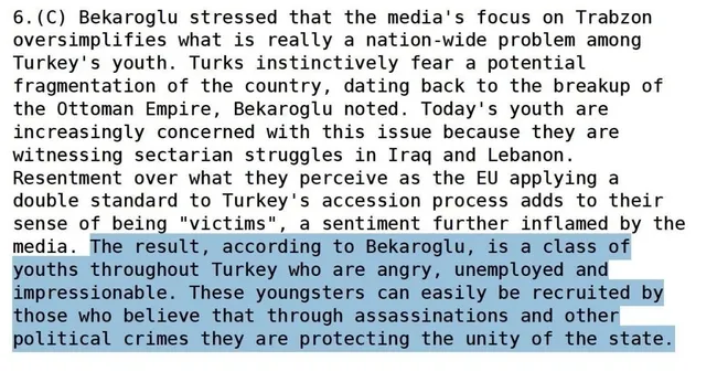 Şu ayrıntıyı görmemezlikten gelmeyin. Email değil, telefon değil, özel mektup değil. Çözülmesi zor telgraf ile. Bekaroğlu, Türkiyedeki genç işsiz oranının çok yüksek olduğunu ve bu gençlerin devletin birliğini koruma amaçlı suikastlara teşebbüs ettirildiğini iddaa ediyor.