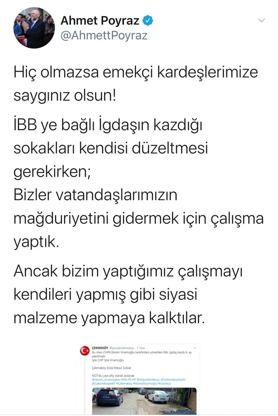 Çekmeköy Belediye Başkanı Ahmet Poyraz ise sosyal medya hesabından bu pişkinliğe isyan etti.