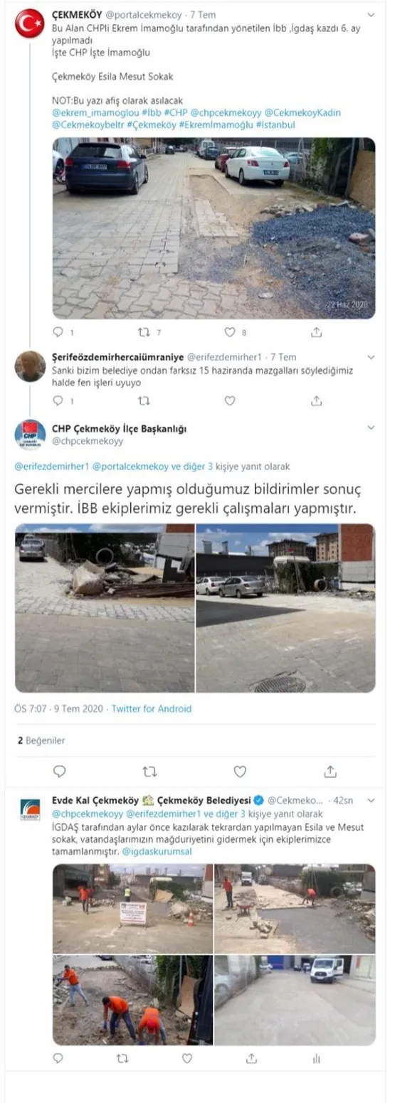 Çekmeköy Belediyesi de bu durumu önce sosyal medya hesabından afişe etti. Daha sonra Çekmeköy Belediyesi söz konusu iki sokaktaki kazılan alanların sokak sakinlerinin mağdur olmaması açısından Çekmeköy Belediyesi ekiplerince yapıldığını duyurdu. Hatta fotoğraf da paylaşıldı.