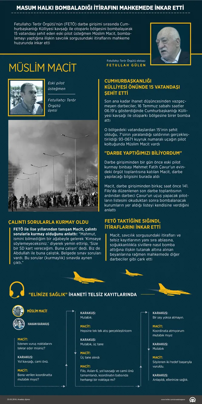 Darbe girişiminde Cumhurbaşkanlığı Külliyesi yakınlarına iki bomba atarak 15 kişinin şehit olmasına, 7 kişinin de yaralanmasına sebep olduğu belirtilen eski pilot üsteğmen Müslim Macit, "Ben o gece hiçbir uçuş yapmadım" diyerek telsiz konuşmalarına yansıyan bombalama eylemini gerçekleştirmediğini iddia etti.