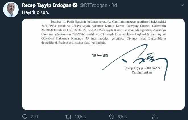 Başkan Recep Tayyip Erdoğan Ayasofya kararını imzaladı. Başkan Erdoğan sosyal medya hesabından yaptığı paylaşımda kararı imzaladığını duyururak 'Hayırlı olsun' mesajını paylaştı.