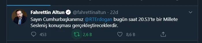 Kararın ardından tüm gözler bu sefer Başkan Erdoğan'a çevrildi. Merakları gideren isim Cumhurbaşkanlığı İletişim Başkanı Fahrettin Altun oldu. Altun sosyal medya hesabından yaptığı açıklamada, Başkan Erdoğan'ın bugün saat 20:53'de bir Millete Sesleniş konuşması gerçekleştireceğini duyurdu.