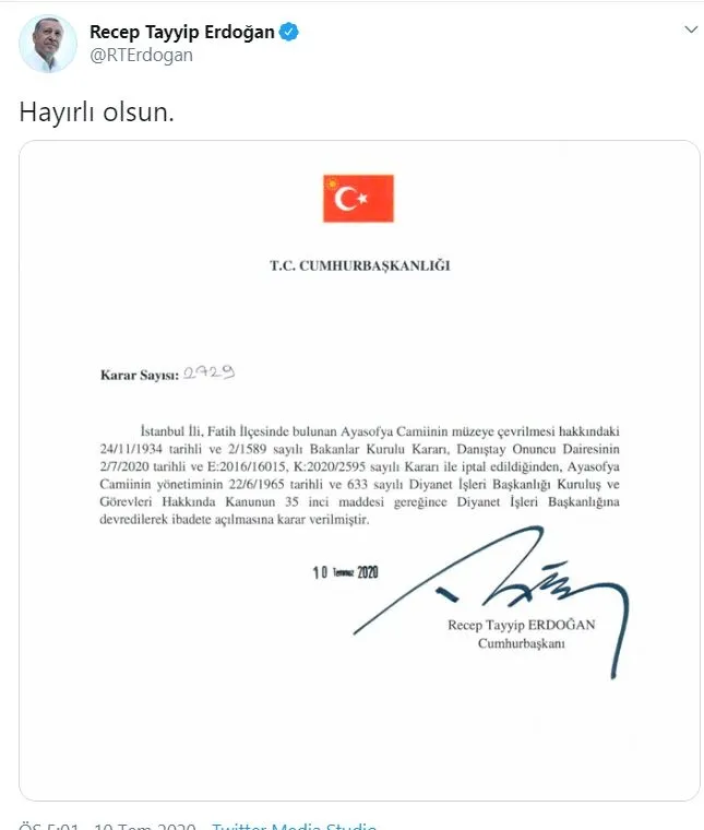 Danıştay'ın söz konusu kararın ardından da Başkan Recep Tayyip Erdoğan Ayasofya'nın ibadete açılmasına yönelik kararnameyi imzaladı. Erdoğan, Ayasofya'nın Diyanet İşleri Başkanlığına devredilerek ibadete açılmasına yönelik Cumhurbaşkanlığı Kararını "hayırlı olsun" mesajıyla paylaştı