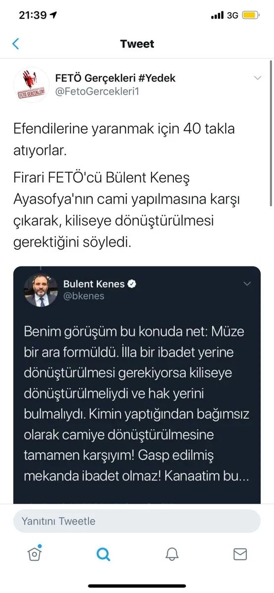 "Haçlıların ülkenizi işgal etmesi tehlikeli değildir" diyen teröristbaşı Gülen'in elemanı firari Bülent Keneş, Ayasofya'nın camiye dönüştürülmesine tamamen karşı olduğunu söyleyerek zihniyetini bir kez daha belli etti.