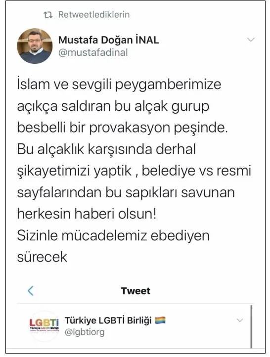 "Türkiye LGBTİ Birliği (@lgbtiorg) adlı twitter kullanıcısı, twitter adlı internet sitesinden yaptığı 13 Temmuz 2020 tarihli "İslam = #Pedofili" mesajı ve bu mesajın altında paylaştığı İslam dininin peygamberi Hz. Muhammed'e ilişkin çok çirkin bir karikatür ile tahammül edilmesi imkânsız hakaret ve ithamları içerir sözleri birden fazla kişiye ulaşarak, toplumun muayyen bir kesiminin aşağılanmasına, toplum önünde küçük düşürülmesine ve yıpratılmasına sebep olmuştur.."