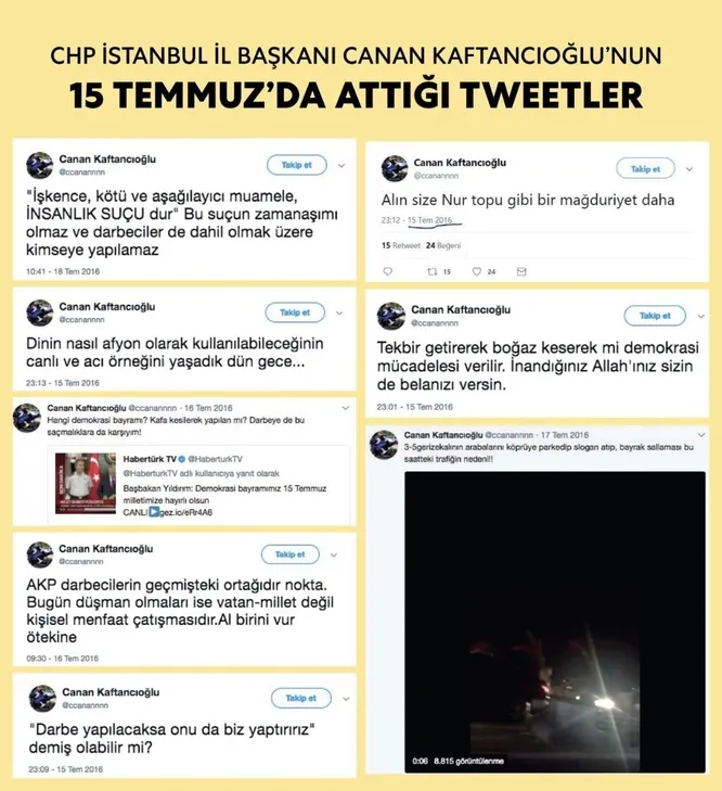 15 Temmuz Demokrasi ve Milli Birlik Günü’nün dördüncü yıldönümünde CHP İstanbul İl Başkanı Canan Kaftancıoğlu’nun 15 Temmuz gecesi attığı ihanet gibi tweetler akla geldi. Kaftancıoğlu’nun hain girişimi yapan Fetullahçı Terör Örgütü’ne ses çıkarmaması dikkat çekti. 16 Temmuz 2016 saat 01.43’te Kaftancıoğlu, “Bu saatte ezan okumak suretiyle kalkışma yapanlara ne diyecek ne yapacağız şimdi?” diyerek FETÖ’ye destek vermişti.