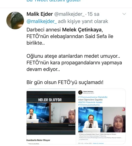 Skandal ifadelerin ardından Ak Parti Hatay Milletvekili Abdulkadir Özel, Melek Çetinkaya'nın katıldığı programı sosyal medya hesabından 'FETÖ'cülük nedir? Uygulamalı anlatım' şeklinde paylaşımda bulunarak tepki gösterdi.