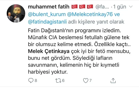 Geçtiğimiz günlerde bir televizyon programına katılan Melek Çetinkaya'nın yaptığı açıklamalarla maskesi yere düştü. Çıktığı televizyonda moderatörün sorusu üzerine konuşan skandal açıklamalarda bulunan Çetinkaya'nın FETÖ elebaşı için kullandığı ifadeler sosyal medyanın gündemine oturdu. Fethullah Gülen'e terörist diyemeyen Çetinkaya konuşmasında şu ifadeleri kullandı; "Ben Fethullah Gülen'e teröristtir diyemiyorum ama bana bu cemaatin içindeki insanlardan komşularım oldu. Ben tertemiz insanlar olduklarını düşünüyorum. Bu insanlarla 3-4 sene komşuluk yaptım."