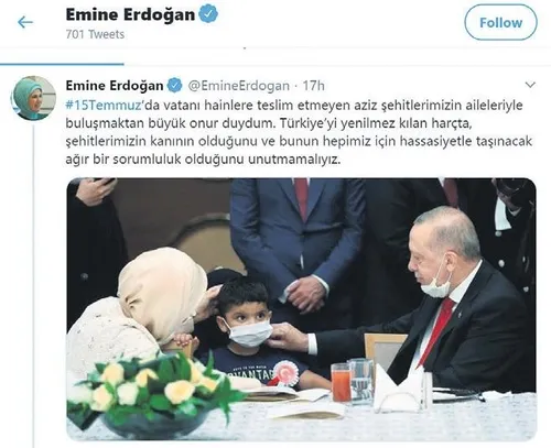 Cumhurbaşkanı Recep Tayyip Erdoğan'ın eşi Emine Erdoğan, 15 Temmuz şehitlerini andı. Emine Erdoğan, Twitter hesabından yaptığı paylaşımda, "Vatanı hainlere teslim etmeyen aziz şehitlerimizin aileleriyle buluşmaktan büyük onur duydum. Türkiye'yi yenilmez kılan harçta, şehitlerimizin kanının olduğunu ve bunun hepimiz için hassasiyetle taşınacak ağır bir sorumluluk olduğunu unutmamalıyız" ifadelerine yer verdi.Emine Erdoğan, paylaşımında Cumhurbaşkanlığı Külliyesi'nde düzenlenen 15 Temmuz Şehitleri Anma Programı'nda bir şehit çocuğunun da bulunduğu fotoğrafa yer verdi.