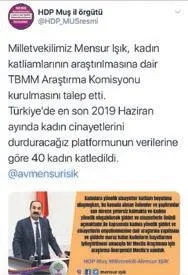 HDP'Lİ Mensur Işık'ın, 10 ay önce TBMM'de kadın cinayetlerinin araştırılması için önerge verdiği de ortaya çıktı. Mensur Işık, araştırma önergesine ilişkin yaptığı konuşmada, "Kadınlara yönelik cinayetler katliam boyutuna ulaşmışken, bu konuda alınan önlemler ve yaptırımlar son derece yetersiz kalmakta ve kadına yönelik oluşabilecek şiddet ve cinayetlerin önünü açmaktadır" ifadelerini kullanmıştı