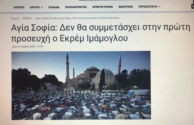 Yunanistan'da yer alan medya kuruluşları Ayasofya Camii'ndeki Cuma namazına İmamoğlu'nun katılmayacağı bilgisini aktarırken bu habere büyük yer verdi. Yunanistan'daki birçok medya kuruluşu Ayasofya Camii ile alakalı her ayrıntıyı anbean haberleştirmeyi sürdürüyor.