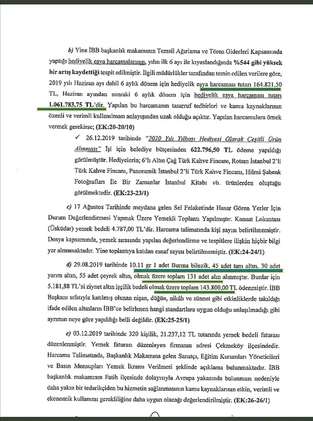 İBB Denetim Raporu'nda, "İBB Başkanı sıfatıyla katılmış olunan nişan, düğün, nikâh ve sünnet gibi etkinliklerde takıldığı ifade edilen altınların belediyece belirlenen hangi standartlara uygun olduğu anlaşılmadığı gibi ayrımın neye göre yapıldığı belli değil" ifadeleri kullanıldı. İBB Denetim Komisyonu Raporu'nda, Çekmeköy İlçesi'nde 3 Aralık 2019 tarihinde 320 kişilik yemek için 21 bin 237 lira tutarında yemek bedeli faturası düzenlendi bilgisi de yer aldı.