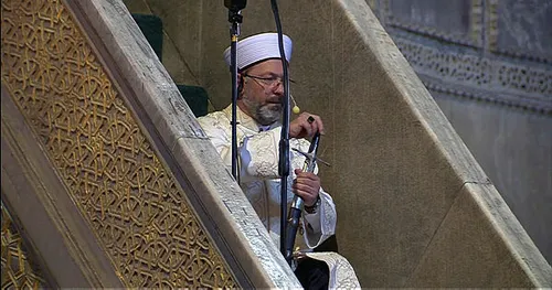 Erbaş, "Ayasofya: Fethin nişanesi, Fatih'in emaneti" başlıklı hutbesini okumak için minbere kılıçla çıktı.