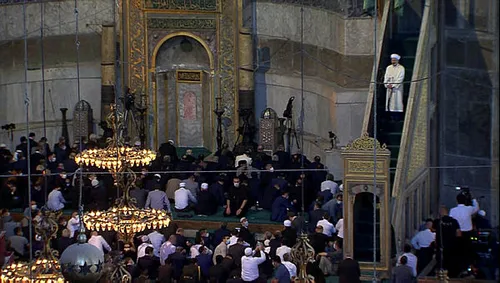 "Ey insanlar, Ayasofya Camii'nin kapıları, tıpkı Süleymaniye, Selimiye, Sultanahmet ve diğer camilerimiz gibi, hiçbir ayrım gözetmeksizin Allah'ın bütün kullarına açık olacaktır. Ayasofya Camii'nin manevi atmosferinde inanca, ibadete, tarihe ve tefekküre uzanan yolculuk inşallah kesintisiz devam edecektir. Cenab-ı Hak, şanlı tarihimizde mümtaz bir yeri, gönüllerimizde müstesna bir değeri olan Ayasofya Camii'ne hakkıyla hizmet etmeyi bizlere nasip eylesin. Ayasofya gibi serapa ihtişam olan bir cami-i şerife hakkıyla ihtiram göstermeyi bizlere lütfeylesin. Kültürümüzün ve kimliğimizin korunmasında, Ayasofya Camimizin yeniden ibadete açılmasında emeği geçen bütün devlet büyüklerimizi, dua eden, sevincimizi paylaşan herkesi, sevdiği ve razı olduğu kullar zümresine ilhak eylesin."