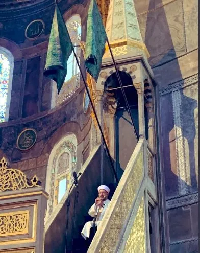 "Bugün, bundan 70 sene önce hemen karşımızdaki Sultanahmet Camisi minarelerinin 16 şerefesinden 16 müezzinin Allah'u ekber sadalarıyla yeri göğü inlettiği, 18 yıl ayrılıktan sonra minarelerimizin ezanlara kavuştuğu anın bir benzerini yaşadığımız gündür. Bugün, müminlerin sevinç gözyaşları içinde kıyama durduğu, huşuyla rükua vardığı ve şükürle secdeye kapandığı gündür. Bugün, şeref ve tevazu günüdür. Bizleri böyle onurlu bir güne kavuşturan, yeryüzünün en mukaddes mekanları olan camilerde buluşturan ve ulu mabet Ayasofya'da huzuruna kabul eden Cenab-ı Hakk'a sonsuz hamdüsenalar olsun.