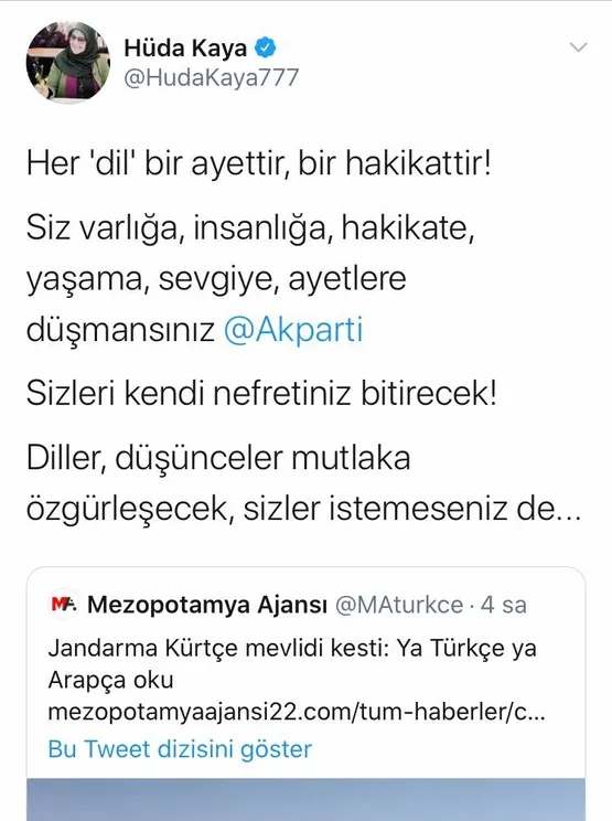 HDP İstanbul Milletvekili Hüda Kaya da; Mezopotamya Ajansı'nın yalan haberini sosyal paylaşım sitesi Twitter'daki şahsi hesabından paylaştı ve "Diller, düşünceler mutlaka özgürleşecek, sizler istemeseniz de..." iddiasında bulundu.