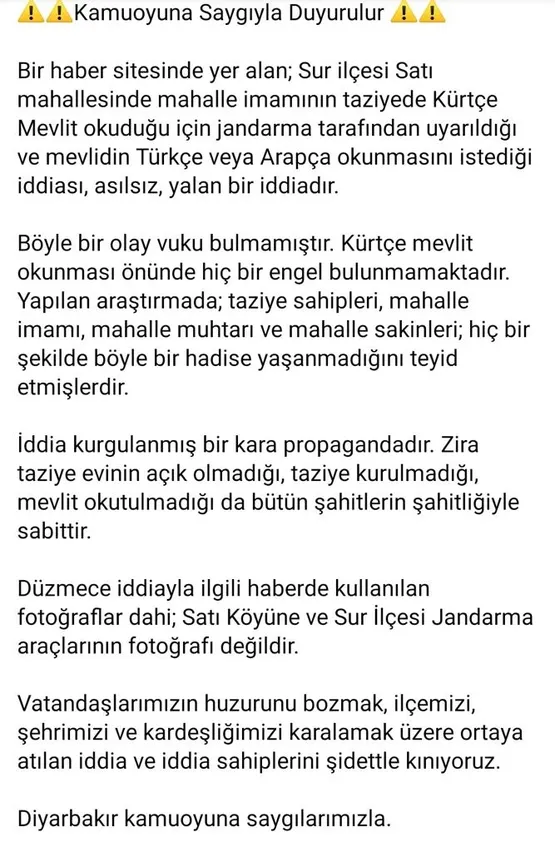"Böyle bir olay vuku bulmamıştır. Kürtçe mevlit okunması önünde hiç bir engel bulunmamaktadır. Yapılan araştırmada; taziye sahipleri, mahalle imamı, mahalle muhtarı ve mahalle sakinleri; hiç bir şekilde böyle bir hadise yaşanmadığını teyid etmişlerdir."