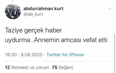 "Korona dolayısıyla taziye yasağı var. Tüm taziye dilekleri için teşekkürler.. Cümlemizin ölmüşlerine ve bizlere de hatta Allah rahmet göstersin. Doğrudan, doğruluktan ayırmasın. Merhameti yüreğimizin hakimi kılsın, adaleti rehberimiz, basireti becerimiz, muvaffakiyeti neticemiz kılsın.."
