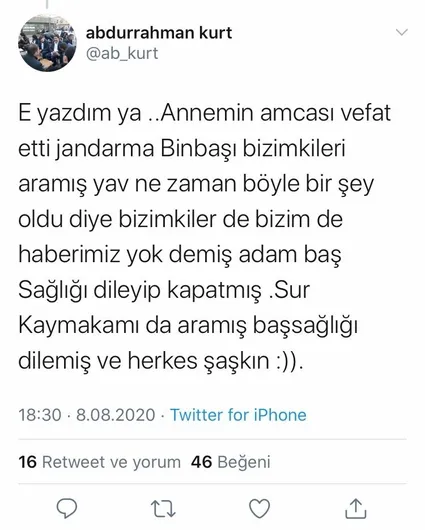 Abdurrahman Kurt; şunları söyledi: "(...) Annemin amcasıvefat etti. Jandarma binbaşı bizimkileri aramış, 'Yav ne zaman böyle bir şey oldu' demiş.Bizimkiler de; 'Bizim haberimiz yok' demiş. Jandarma binbaşı başsağlığı dileyip kapatmış. Sur Kaymakamı da aramış ve başsağlığı dilemiş. Herkes şaşkın.."