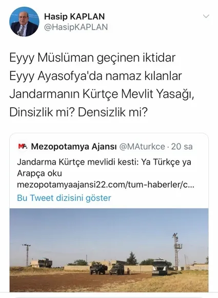 Eyyy Ayasofya'da namaz kılanlar.. Jandarmanın Kürtçe Mevlit Yasağı, Dinsizlik mi? Densizlik mi?" iddiasında bulundu.