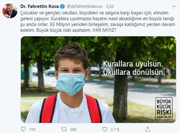 Bakan Koca, Twitter hesabından maske takan çocuğun fotoğrafını, 'Kurallara uyulsun, okullara dönülsün' notuyla paylaştı. Bakan Koca, "Çocuklar ve gençler; okulları, büyükleri ve salgına karşı başarı için, elinden geleni yapıyor. Kurallara uyulmazsa hayatın nasıl aksadığının en büyük tanığı şu anda onlar. 83 milyon yeniden birleşelim, savaşa kaldığımız yerden devam edelim. Büyük küçük riski azaltalım. Var mıyız?" ifadelerini kullandı.