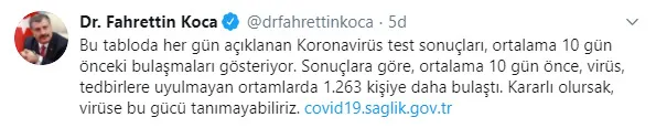 Sağlık Bakanı Fahrettin Koca sosyal emdya hesabından yaptığı payalaşımda "Bu tabloda her gün açıklanan Koronavirüs test sonuçları, ortalama 10 gün önceki bulaşmaları gösteriyor. Sonuçlara göre, ortalama 10 gün önce, virüs, tedbirlere uyulmayan ortamlarda 1.263 kişiye daha bulaştı. Kararlı olursak, virüse bu gücü tanımayabiliriz. https://covid19.saglik.gov.tr" ifadelerine eyr evrdi.