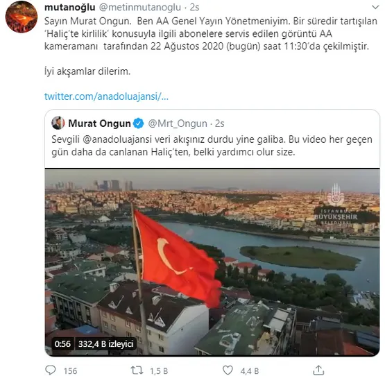 Murat Mutanoğlu, sosyal paylaşım sitesi Twitter'daki şahsi hesabından yaptığı açıklamada; "Sayın Murat Ongun. Ben AA Genel Yayın Yönetmeniyim. Bir süredir tartışılan 'Haliç'te kirlilik' konusuyla ilgili abonelere servis edilen görüntü AA kameramanı tarafından 22 Ağustos 2020 (bugün) saat 11:30'da çekilmiştir. İyi akşamlar dilerim" ifadelerini kullandı.