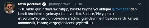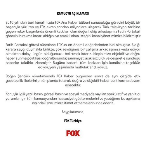 Açıklamada şunlar kaydedildi: "2010 yılından beri kanalımızda FOX Ana Haber bülteni sunuculuğu görevini büyük bir başarıyla yürüten ve FOX ekranlarından milyonlara ulaşarak Türk televizyon tarihine geçen rekor başarılarda önemli katkıları olan değerli ekip arkadaşımız Fatih Portakal, görevini bırakma kararı aldığını ve emekli olma isteğini kanal yönetimimize bildirmiştir.
