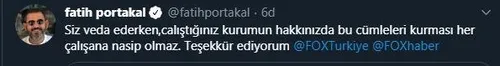 Fatih Portakal görevi süresince FOX'un en önemli değerlerinden biri olmuştur. Aldığı karara saygı duymakla birlikte, çok sevdiğimiz bir çalışma arkadaşımıza veda ediyor olmaktan dolayı üzgün olduğumuzu belirtmek isteriz. İzleyicimize objektif ve doğru haber sunma politikası doğrultusunda; samimiyet, açık sözlülük ve cesaretle sunduğu haberler takdirle izlenmiştir. Bugüne kadarki tüm katkıları için kendisine teşekkür ediyor, yeni yaşamında mutluluklar diliyoruz.